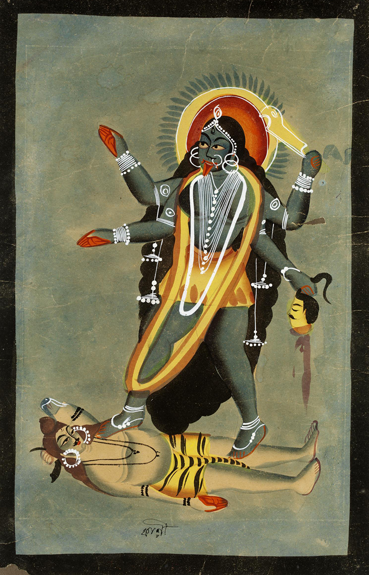 Krishna as Kali, and Shiva. Opaque watercolour on paper. Kolkata, ca. 1885. © Victoria and Albert Museum, London.Images of Kali and Shiva dancing with wild abandon are found throughout India especially in West Bengal. Bengali poetry has vivid imagery of Shiva and Kali dwelling in cremation grounds, immersed in yogic practices and competing fiercely in the tandawa, the dance of destruction. In fact, Shiva’s wife Parvati, the demure feminine energy is seen as a frightened bystander as the two forces of nature are engaged in dramatic exchanges of destruction.
