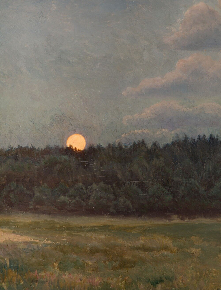 A Realist Polish painter and illustrator, Chelmonski was known for his landscape painting. With nature as his inspiration and subject matter, Chelmonski evokes a moment of peace and beauty. The understated elegance and simplicity of this painting slowly pulls the viewer into deeper contemplation of the beauty of this moonrise and an experience of tranquillity.