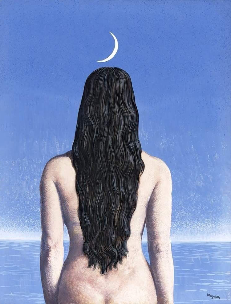 A Belgian Surrealist artist, Magritte often stated that he left it to the viewer to find their own meaning in his painting. Here then is a nude woman with her back to us, standing in front of a calm river. Above a beautiful crescent Moon illuminates a clear night sky and seems to almost adorn her head. There is a sense of serenity in the painting. But there is also a subtle play of sensibilities. She is turned away from us, seemingly lost in private contemplation, one that we intrude upon. And in her gorgeous figure and lush hair there is a sense of the archetypal Woman being invoked. And then finally there is the incongruity of naming a picture of a nude woman – “The Evening Gown”.