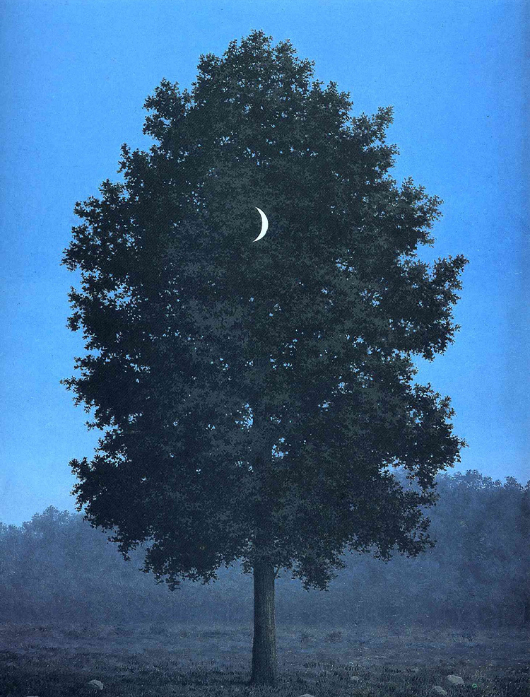 In this witty, strange painting a crescent Moon is superimposed upon a tree. Rene Magritte called his practice of intentional juxtaposition of incongruous objects “objective stimulus.” With reference to this image, Magritte observed: “I have just painted the moon on a tree in the grey-blue colours of evening.”