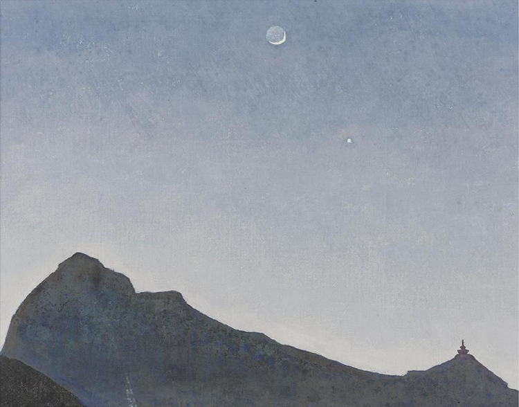Nicholas Roerich was “a Russian painter, writer, archaeologist, theosophist, philosopher and public figure, who in his youth was influenced by a movement in the Russian society around the spiritual. He was interested in hypnosis and other spiritual practices and his paintings are said to have hypnotic expression.” He died in Naggar, Himachal Pradesh. Roerich painted a series of studies on the Himalayan Ranges, including the ‘New Moon’. Of the painting style in the Himalayan series it is said: “The hypnotic, immersive nature of his works truly absorbs the onlooker, leaving one with a sense of peace and tranquillity as one moves with the series through the gallery.”