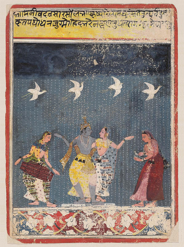 Megha Raga. Central Indian. Circa 1655–60. Opaque watercolor and gold on paper. Gift of John Goelet to Museum of Fine Arts BostonClouds are present in folklores from different parts of the country. In Rajasthani folklore, for example, different formations of clouds are seen as stages of pregnancy which give birth to the rainy season. In another folklore, popular in many regions of the subcontinent, the clouds are a battlefield where the demon Vritra (envisioned as drought) is slain by Indra. It is Vritra’s death which allows for the monsoon to begin.