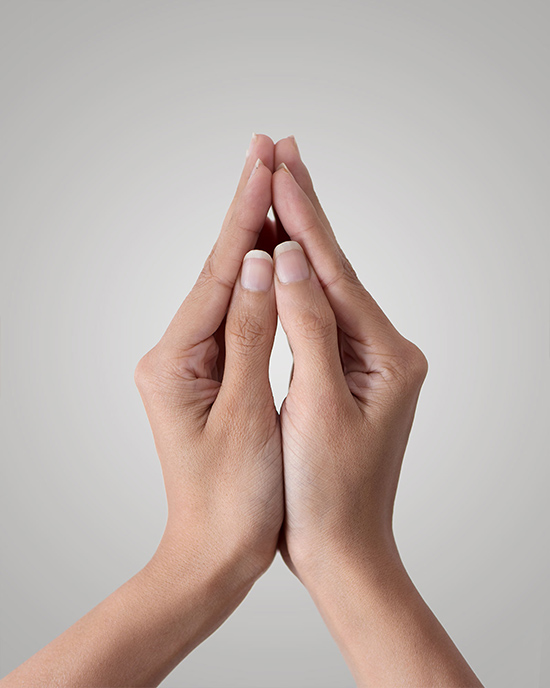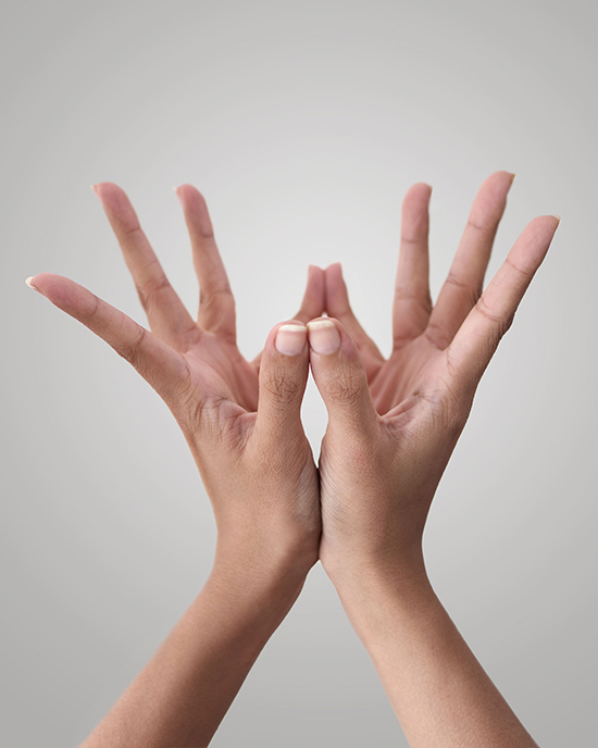 Lotus Mudra: Join the edges of both your hands in front of your chest so that it looks like a flower bud. Align the tips of your fingers and thumbs of one hand with the other hand. Keep the edges of your thumbs and little fingers joined while extending the other fingers outwards, opening up the bud. Take four deep breaths and close your hands again. Now bend your fingers, curling them inwards towards the palms, and bring together the fingernails of both your hands against each other. Then, in a slow downward motion invert your hands until the backs of both hands rest against each other as do the fingers. Hold this position and then, once again, reverse your hands slowly, letting your fingertips remain in contact with each other as you bring your hands back to the closed bud position. Repeat the cycle by opening the bud once again. This is a good mudra to practice when you are feeling lonely or misunderstood. Lotus mudra works on the energy of the Heart chakra and is a symbol of purity.